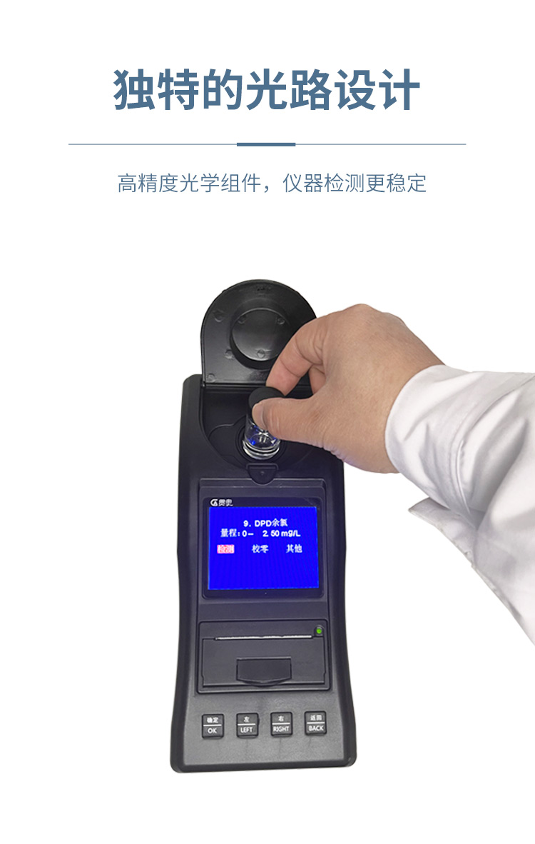 被檢測水質樣品放入DPD游離余氯試劑時,水樣會變成紅色,將水樣放入儀器后,余氯水質檢測儀會通過光電比色檢測原理比較紅色的深淺,從而得出被檢測水質的余氯濃度大小。