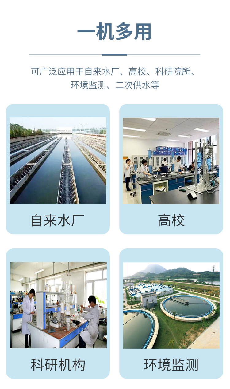 本儀器可用于測定飲用水中的消毒劑指標余氯、總氯、二氧化氯等參數。本儀器可廣泛用于水廠、食品、化工、冶金、環保及制藥等行業,是常用的戶外及實驗室常用儀器。