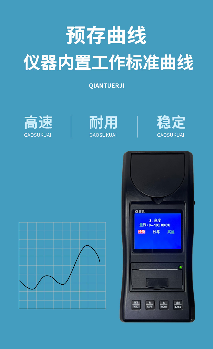 貫奧色度檢測儀可快速準確測定地表水、地下水、城市污水及工業廢水中色度指標,濃度直讀;可廣泛用于水廠、食品、化工、冶金、環保及制藥行業等部門。儀器是由單個的固定波長固定用途的分光光度計糅合而成的,采用分光光度法原理對各參數進行測量,在儀器中建立不同參數的濃度顯色程度與吸光度的線性曲線,儀器通過對顏色的辨別,得出被測水樣的濃度。本儀器采用全中文菜單,操作簡易易懂,使用方便快速測量準確度高。
